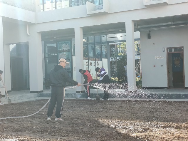 虽以入秋但依然阻挡不了志愿者对种植地的热爱,在志愿服务队队长隋福恩同学的带领下,队员们进行分组展开了明确的分工。同学们相互协作对土地进行松土、浇水等工作。